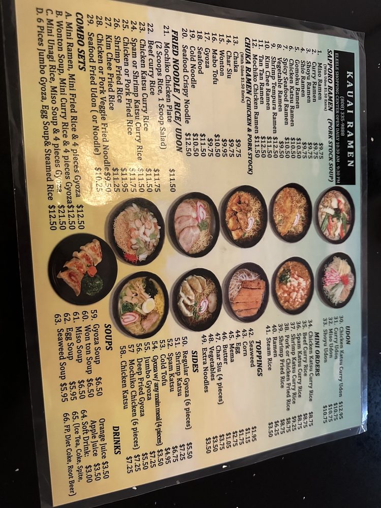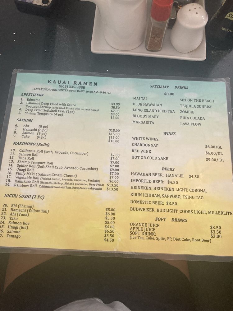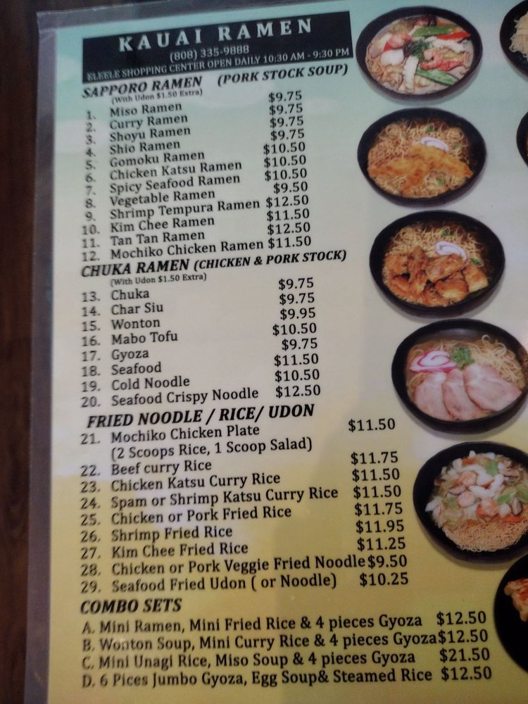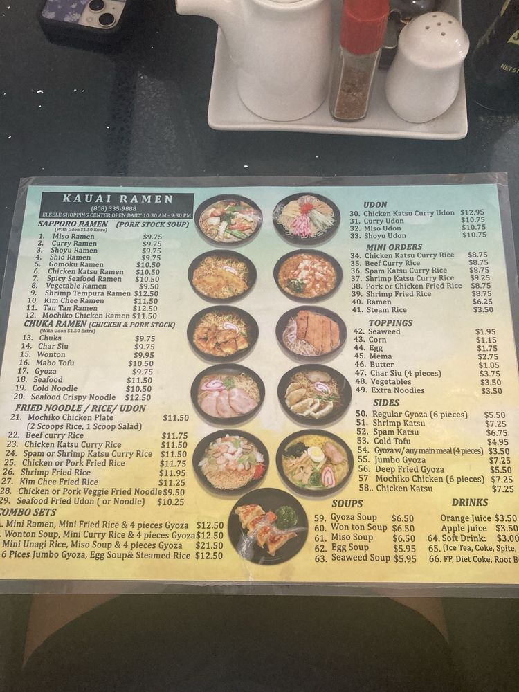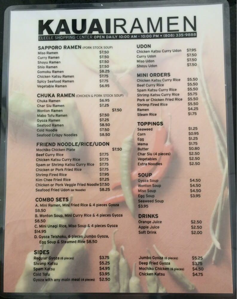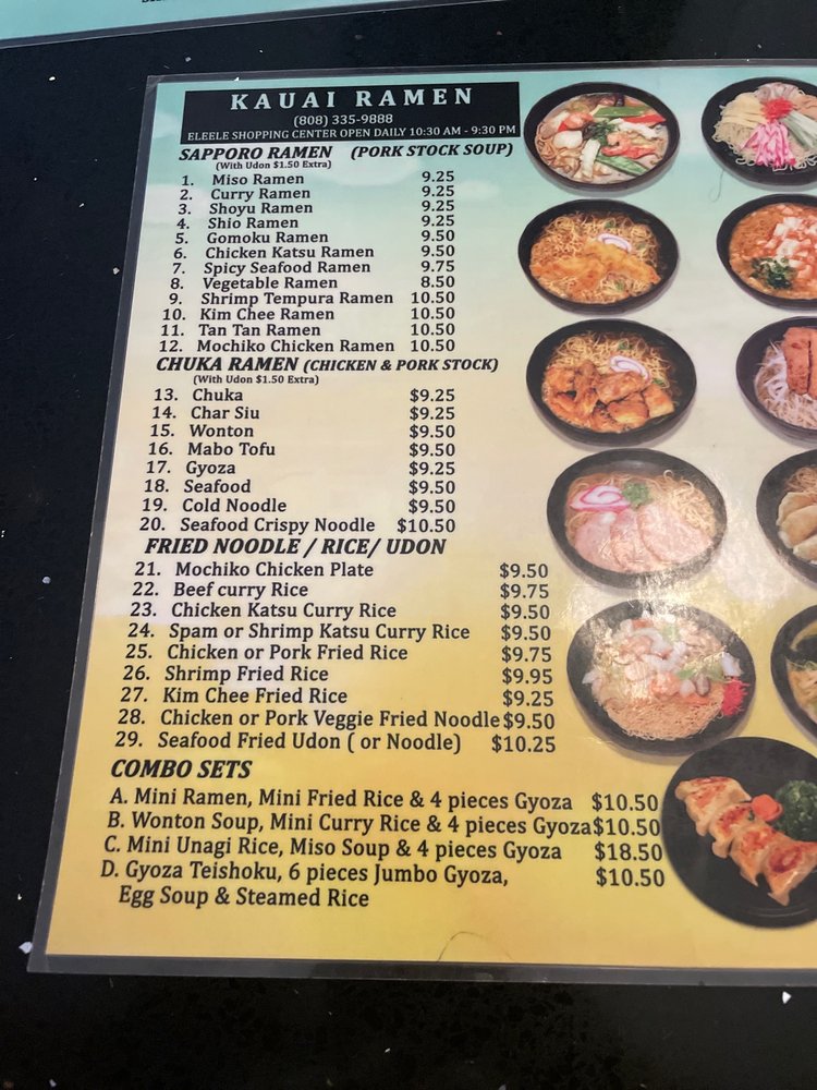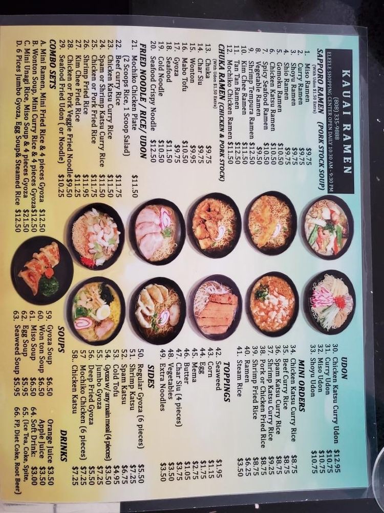If you're on Kauai Island and craving a satisfying bowl of ramen, look no further than Kauai Ramen. Located on Waialo Rd in Eleele, this hidden gem offers generous portions at reasonable prices. Customers rave about the flavorful stock soup, chewy noodles, and efficient service. The menu includes options like tempura ramen, miso ramen, sushi, katsu chicken, and more. Dishes are scrumptious and well-priced, making it one of the best dining values on the island. With vegetarian options, full bar service, and a cozy atmosphere, Kauai Ramen is perfect for a casual meal any time of day. Don't miss out on this humble yet delightful dining experience.